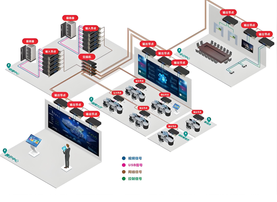 采用分布式架构设计,以核心交换机为数据中枢,通过光纤网络连接各显示终端。系统支持4K分辨率输出,可实现多屏无缝拼接与动态内容切换,满足不同场景下的显示需求。同时,引入负载均衡技术,确保在高并发数据传输时仍能保持系统稳定运行,延迟控制在50ms以内。