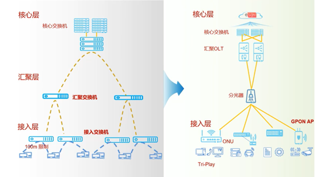 本工程以PON全光网技术为核心,结合机房弱电集成规范,制定“核心层-汇聚层-接入层”三级网络架构方案,确保网络稳定性与扩展性。